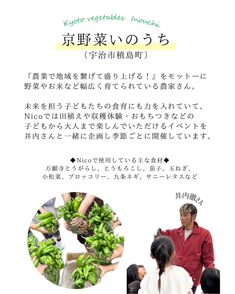 『農業で地域を繋げて盛り上げる!』をモットーに野菜やお米など幅広く育てられている農家さん。未来を担う子どもたちの食育にも力を入れていて、Nicoでは田植えや収穫体験・おもちつきなどの子どもから大人まで楽しんでいただけるイベントを井内さんと企画し季節ごとに開催しています。